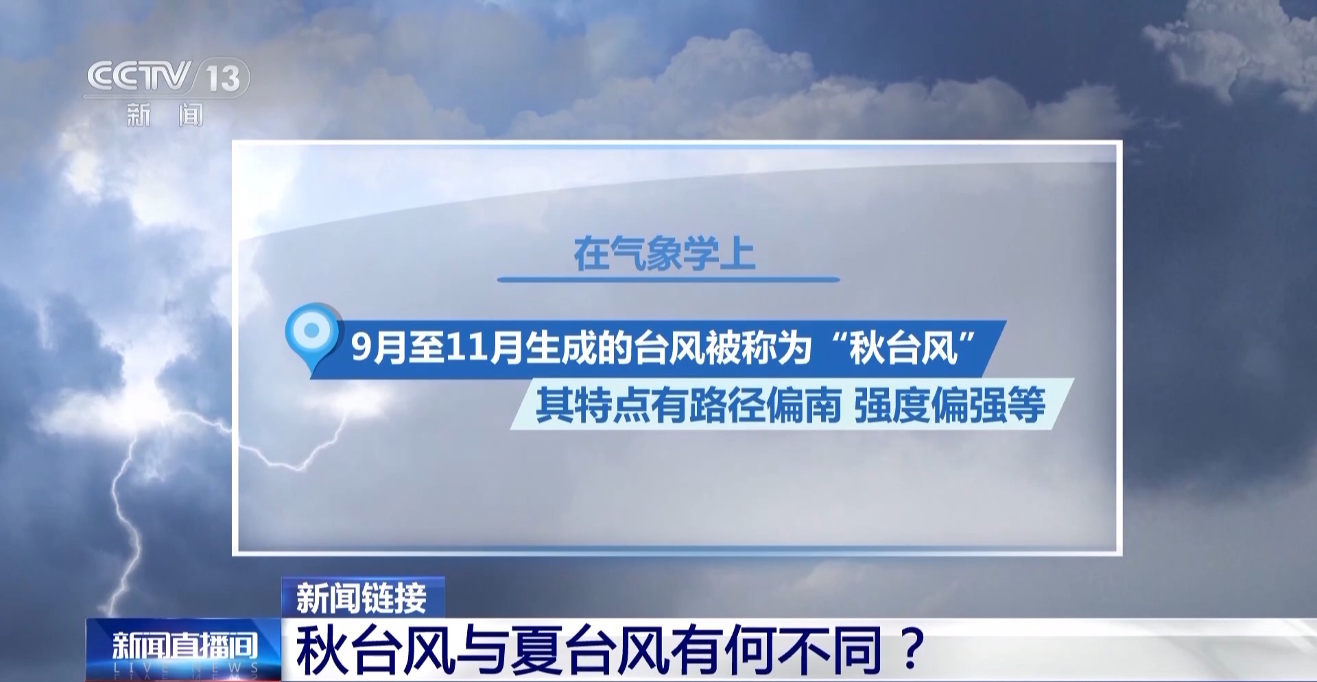 在气象学上,9月至11月生成的台风被称为“秋台风”,其特点有路径偏南、强度偏强等。从常年平均来看,6至8月的夏季台风,平均每年生成11.07个,其中有4.73个登陆我国。9至11月的秋季台风,平均每年生成10.7个,其中有2.33个登陆我国。秋台风从生成数量上虽然与夏台风基本持平,但登陆我国的秋台风比夏台风明显偏少。